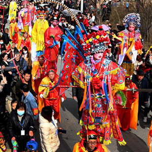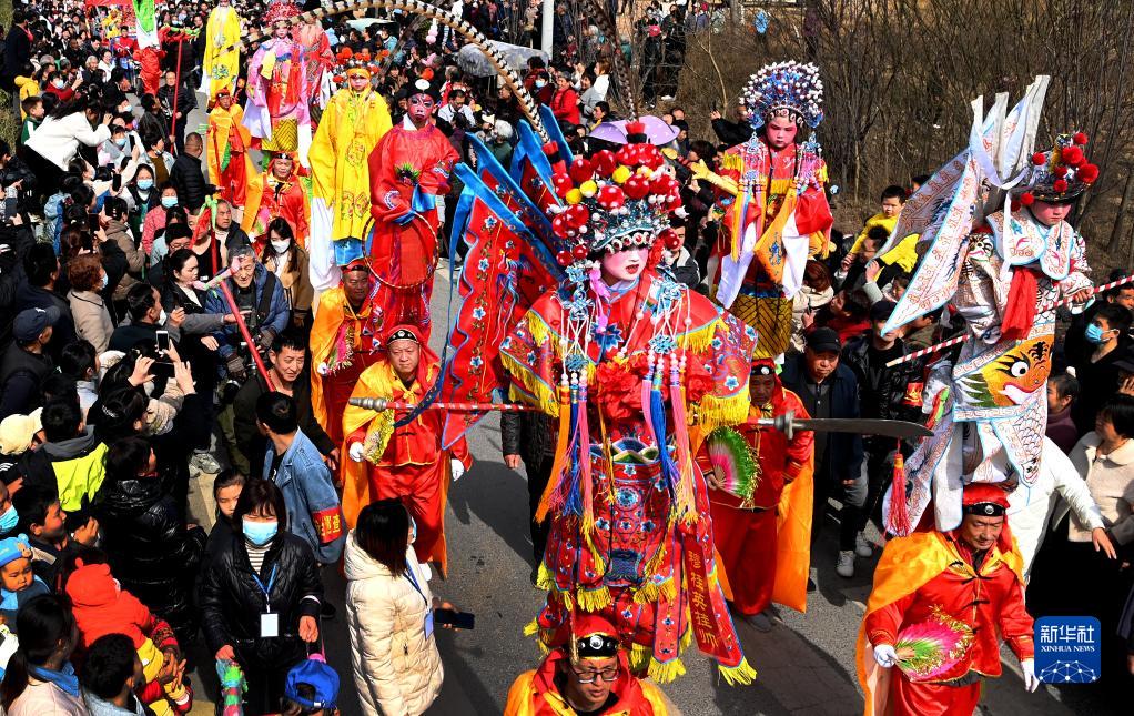 2月19日,西安市臨潼區櫟陽街道卷子村村民在村頭巡回表演“背芯子”。