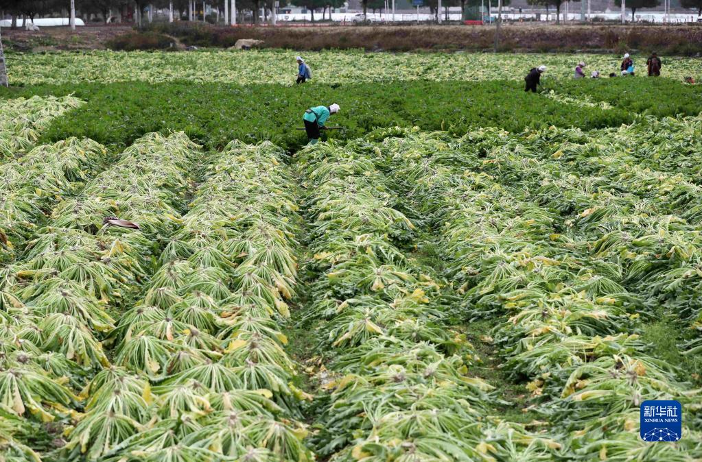 2月19日,村民在貴州省黔東南苗族侗族自治州榕江縣古州鎮車江大壩采收雪里蕻。