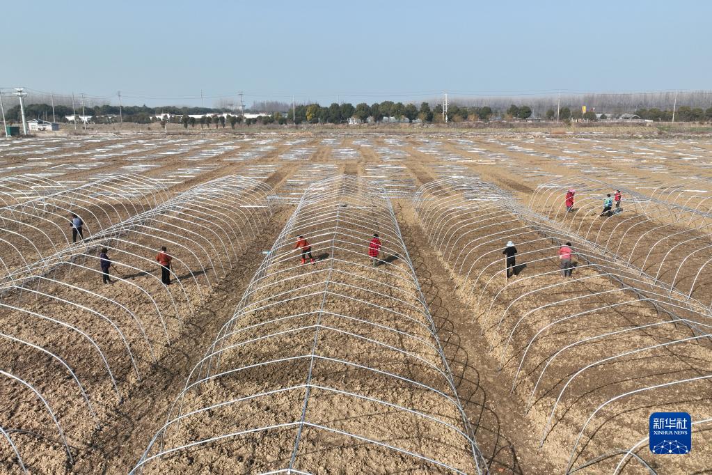 2月20日,在江蘇省淮安市食品科技產業園,工人們在建設蔬菜大棚(無人機照片)。