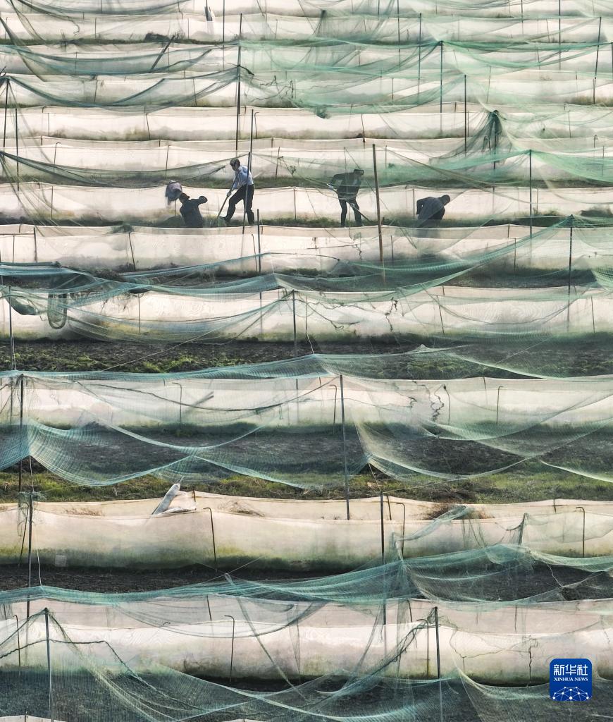 2月20日,在湖南省永州市道縣清塘鎮陳熊村稻蛙基地,村民在清理雜草(無人機照片)。