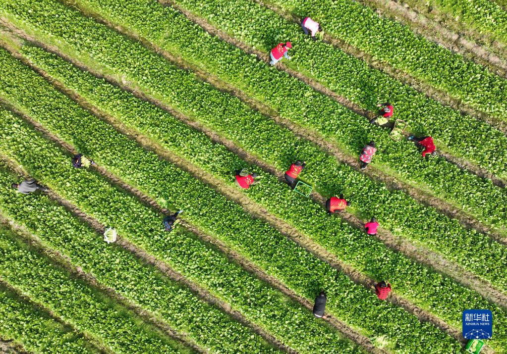 2月20日,湖南省衡陽市衡山縣開云鎮世上村村民在地里采收甜菜心(無人機照片)。