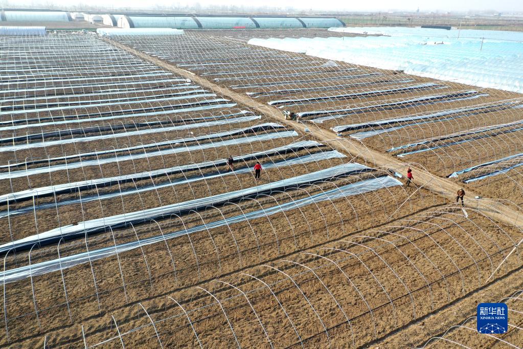2月19日,安徽省蒙城縣岳坊鎮農民在搭建蔬菜拱棚,為移栽早茬西瓜秧苗做準備(無人機照片)。