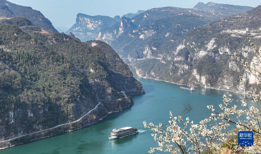 春到峽江,一江春水碧綠,兩岸山花盛開,船舶往來如梭,構成一幅美麗的畫卷。
