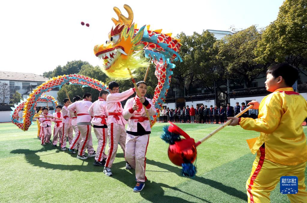 2月20日,江蘇省蘇州市昇平實驗小學校學生表演舞龍,迎接“二月二”。