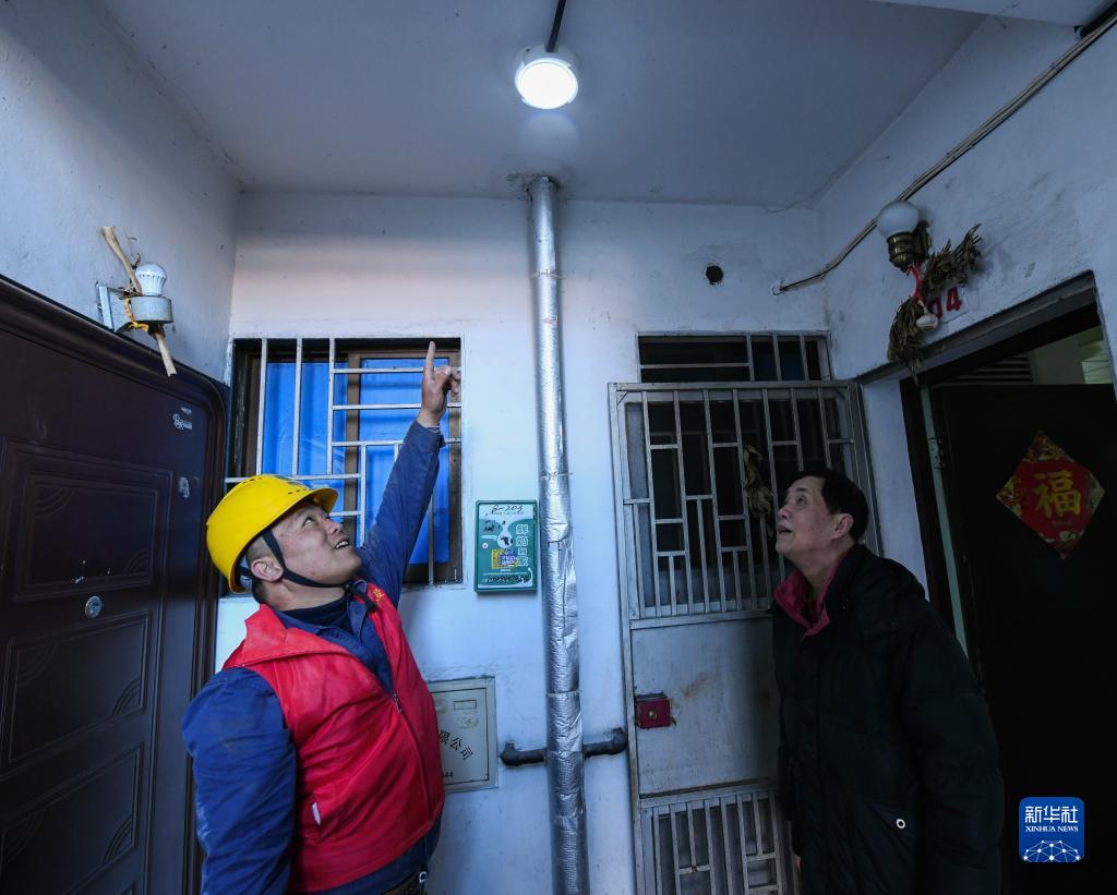 2月20日,在余姚市古建小區,余姚市大城小愛公益服務中心的志愿者向居民展示亮起來的感應燈。
