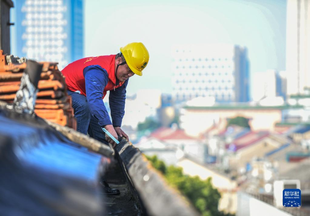 2月20日,在余姚市古建小區屋頂,余姚市大城小愛公益服務中心的志愿者在安裝光伏發電板。