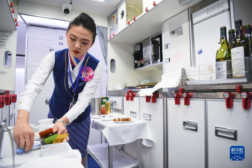 2月20日,參賽乘務員在中國南航廣州產教融合實訓基地的客艙模擬器中準備食物,參加服務實操考核。