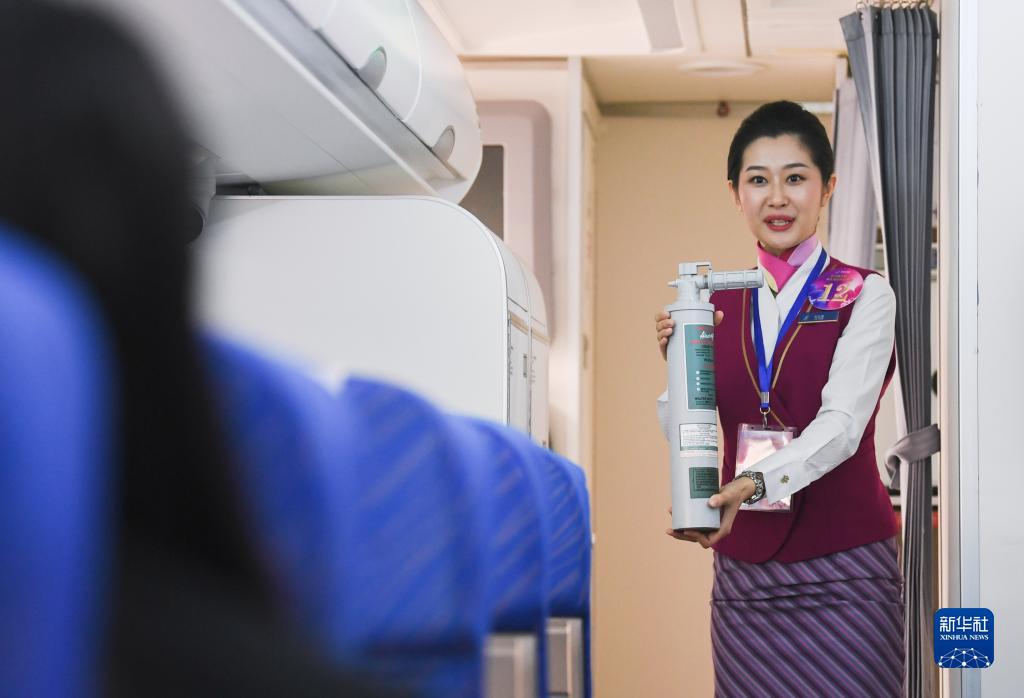 2月20日,參賽乘務員在中國南航廣州產教融合實訓基地的客艙模擬器中手持設備講解,參加安全實操考核。
