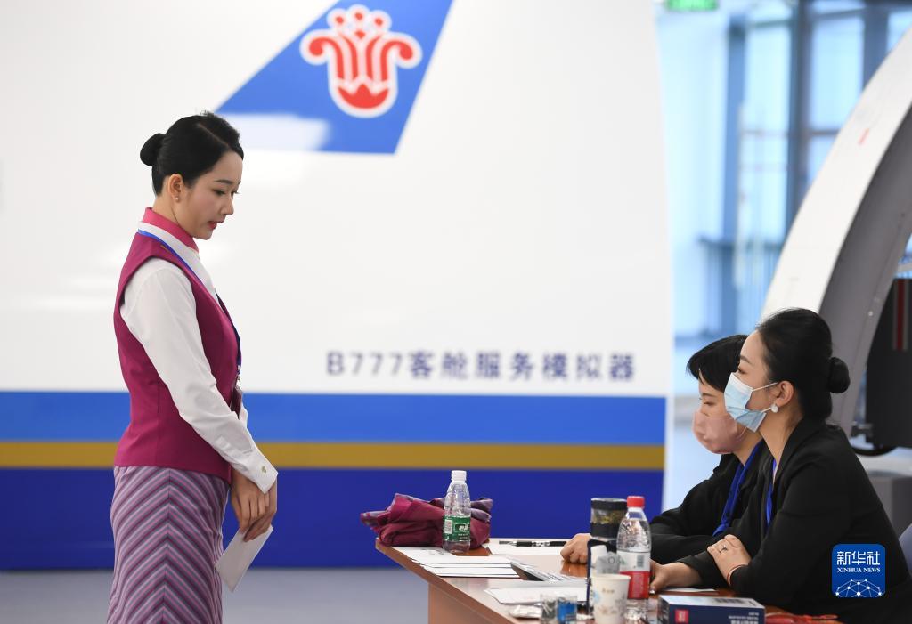 2月20日,參賽乘務員在中國南航廣州產教融合實訓基地參加技能大賽前抽取題目,準備進入客艙模擬器。