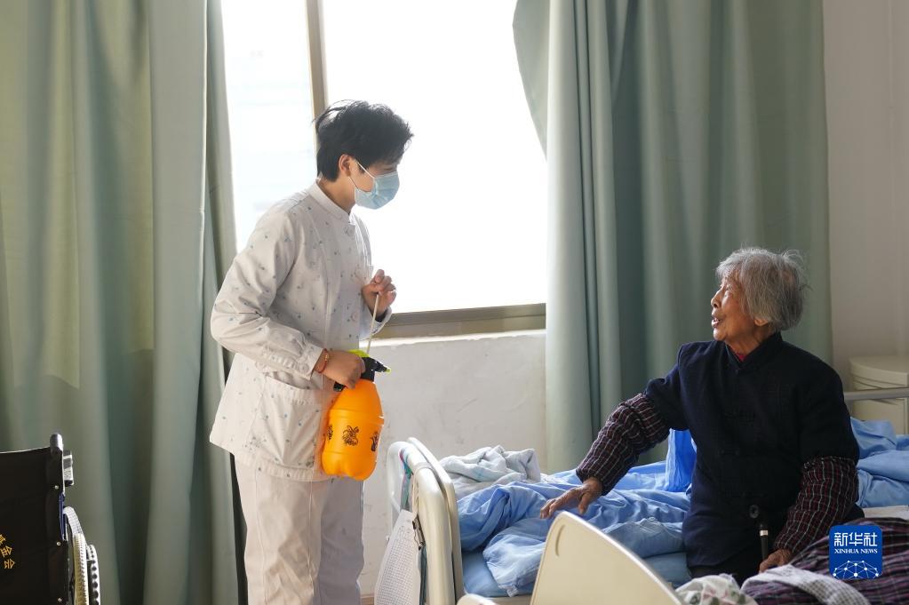 2月15日,在南通常青樂齡護理院,李楠楠在房間消毒時與老人聊天。