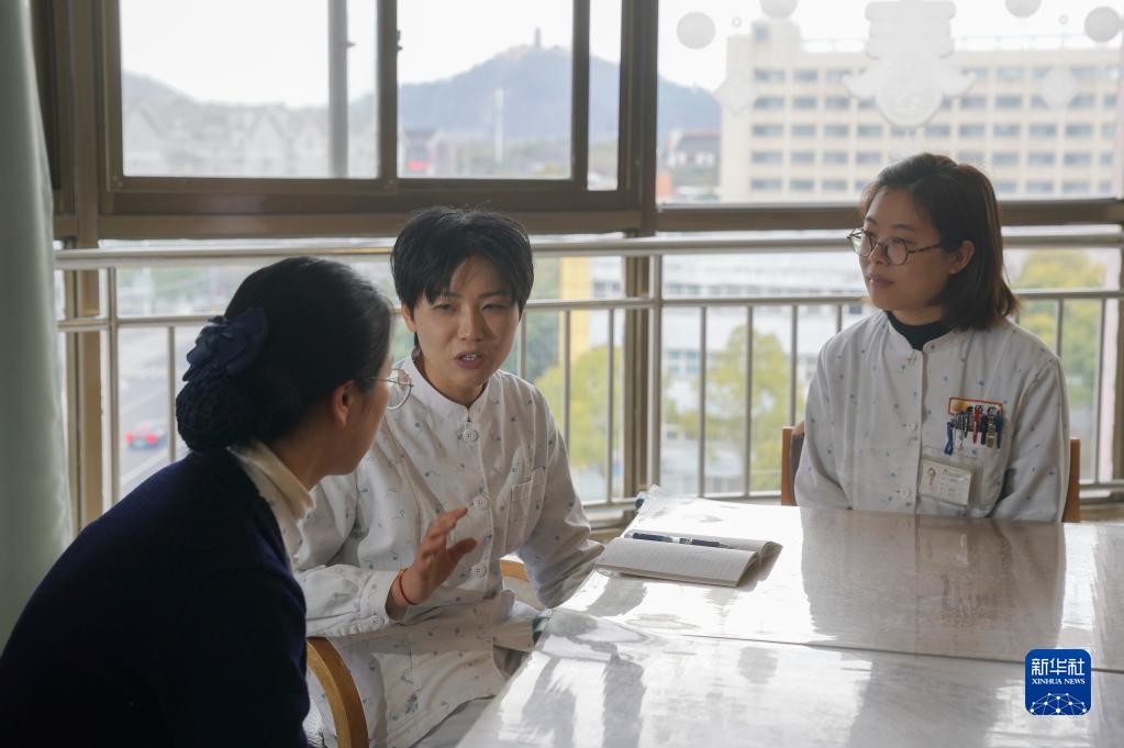 2月14日,在南通常青樂齡護理院,李楠楠(中)聽取同事建議。