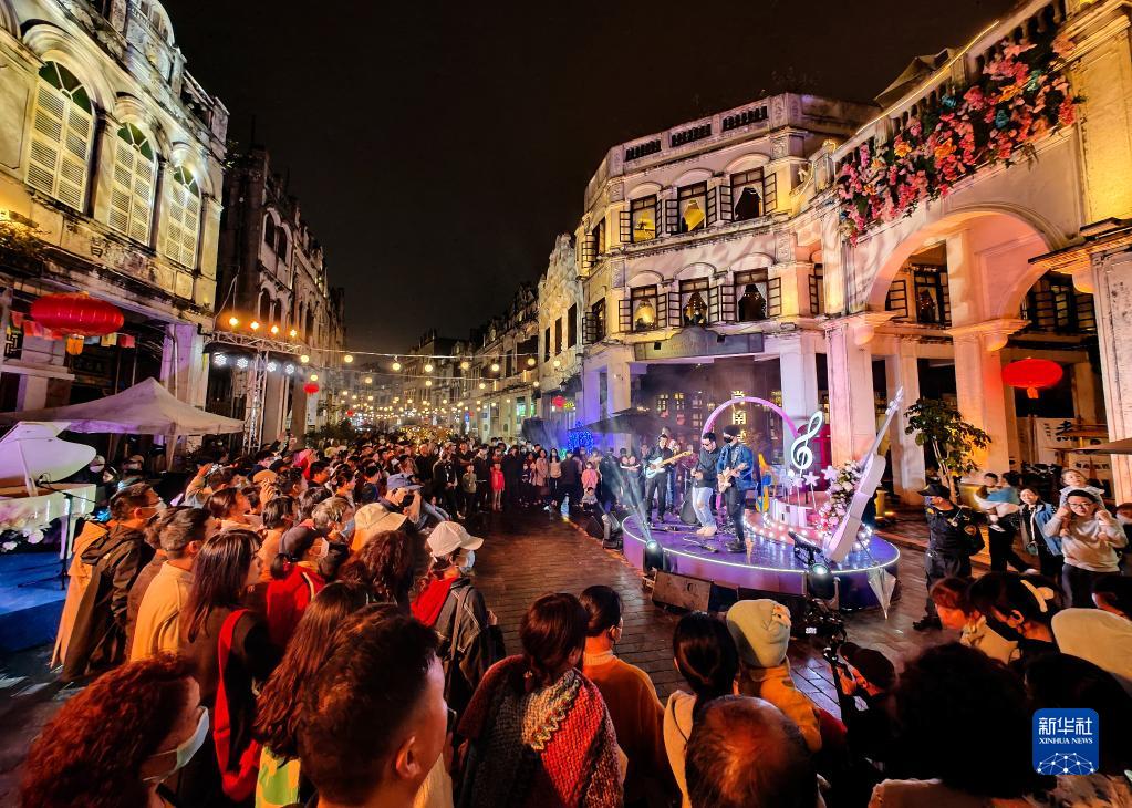游客在??隍T樓老街的中西合璧市集觀看樂隊演出(2月3日攝)。