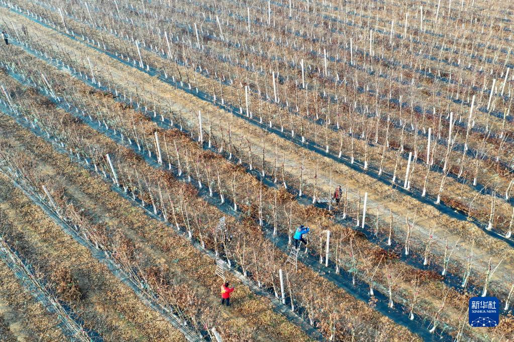 2月19日,在夏莊鎮甲夼區域鄉村振興共富黨建聯盟一處現代化蘋果產業基地內,村民在進行果樹修枝、施肥作業(無人機照片)。