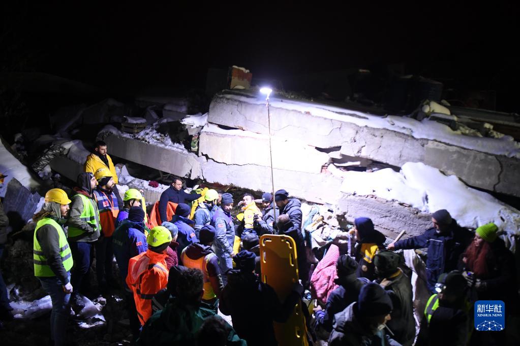 2月7日,救援人員在土耳其卡赫拉曼馬拉什省南部的埃爾比斯坦地區開展地震救援工作。