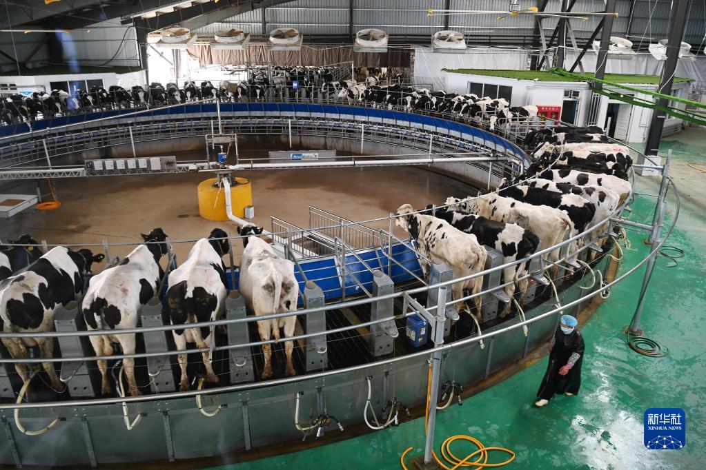 在武威市古浪縣生態奶牛產業園的一家企業牧場,工作人員在轉盤式擠奶機旁工作(2月16日攝)。
