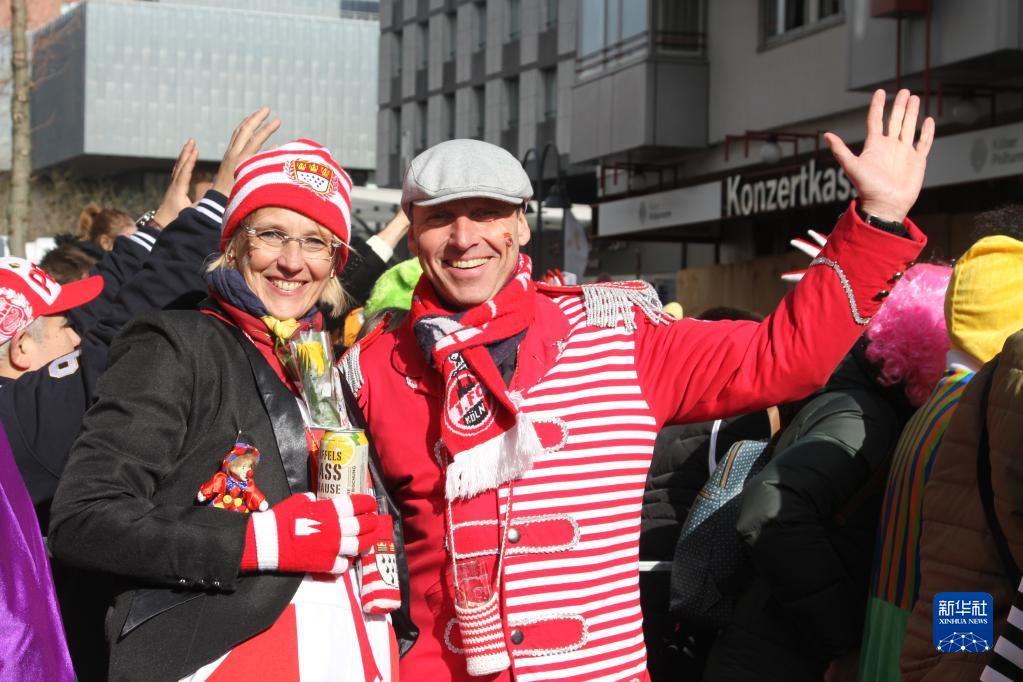 2月20日,在德國科隆,參加“玫瑰星期一”大游行的兩名狂歡者合影。