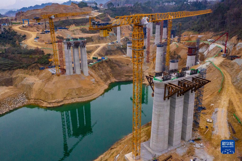 2月20日,工人在三峽庫區湖北省宜昌市秭歸縣三峽樞紐茅坪港疏港鐵路建設工地施工(無人機照片)。