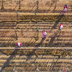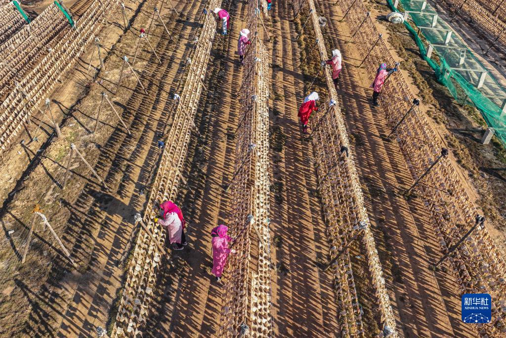 2月20日,在榮成市靖海灣畔一處晾曬場,漁民在晾曬魷魚(無人機照片)。