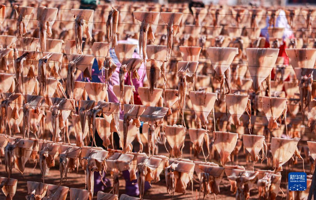 近日,山東省榮成市靖海灣畔的漁民利用晴好天氣,在晾曬場抓緊晾曬魷魚,鋪展開一幅春日“曬鮮圖”。近年來,當地漁民通過電商平臺將魷魚干制品銷往各地市場。