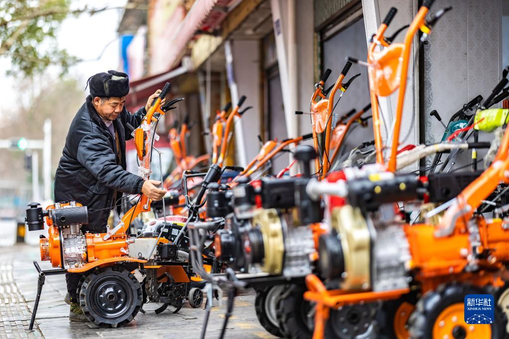 2月20日,農戶在貴州省安順市西秀區一農機銷售點選購農機。