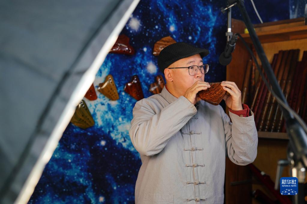 2月20日,陶笛藝人侯義敏在直播中吹奏木質陶笛。