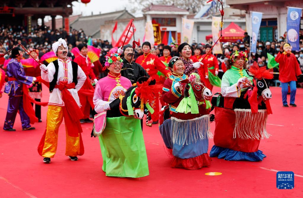 2月21日,在山西省臨汾市襄汾縣陶寺鄉陶寺村,民間社火隊在“二月二龍抬頭社火節”活動中表演傳統民俗“跑驢”。