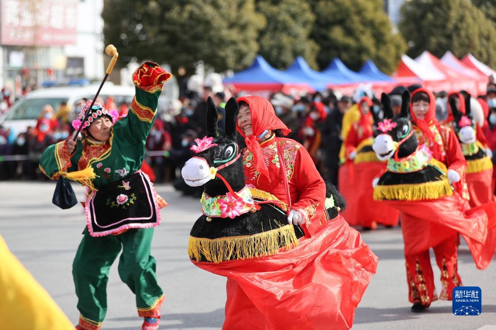 2月21日,在江蘇連云港市贛榆區墩尚鎮,人們在“二月二龍抬頭”民俗表演活動中表演節目。