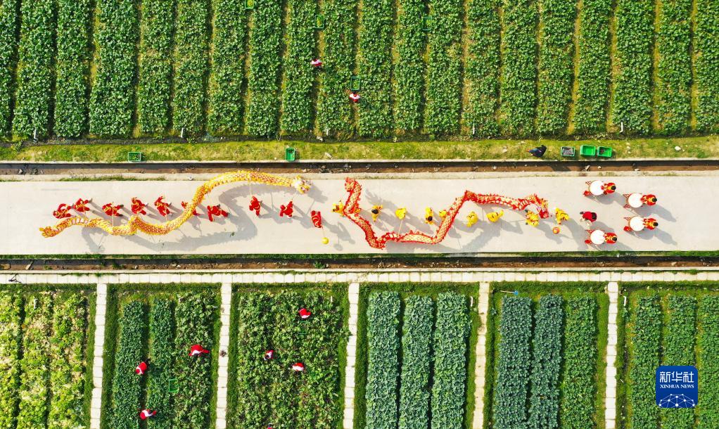 2月21日,湖南省永州市新田縣蓮花學校的孩子們在縣東升農場勞動實踐基地田野間進行舞龍表演(無人機照片)。