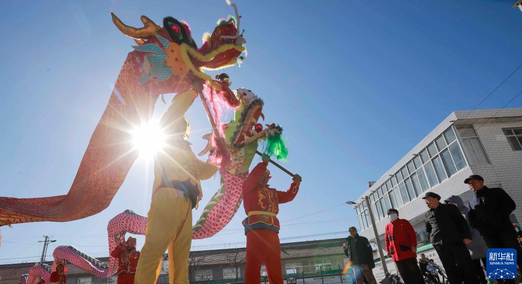2月21日,河北省遵化市鐵廠鎮鐵廠村的民間藝人在表演舞龍民俗節目。