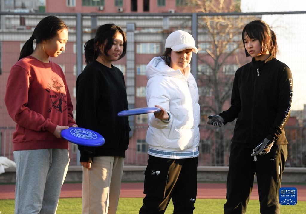 2月20日,在北京大學附屬中學,體育教師王海粟(右二)在體育課中為學生進行極限飛盤動作指導。