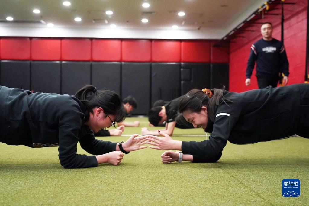 2月20日,在北京大學附屬中學,學生在體育課中進行平板擊掌練習。