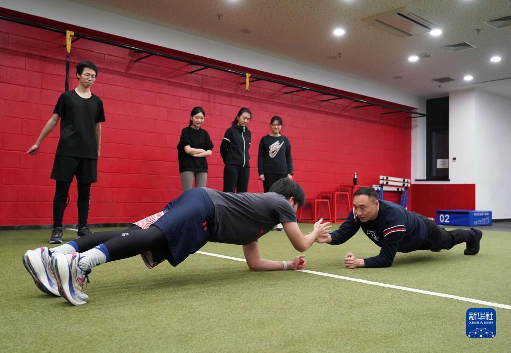 2月20日,在北京大學附屬中學,體育教師龐劍(右一)在體育課中指導學生進行平板擊掌練習。