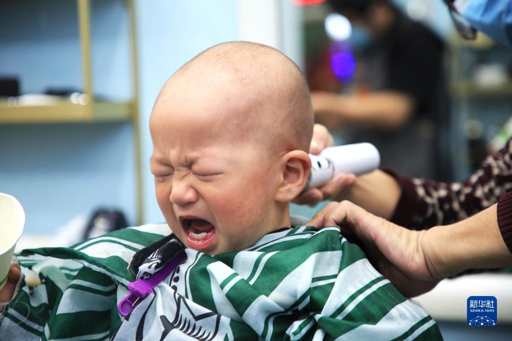 當日是農歷二月初二,許多家長帶著孩子“剃龍頭”,祈求孩子在新一年健康成長。