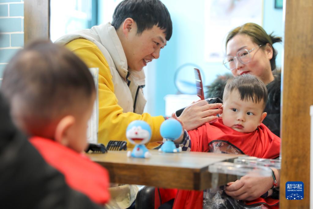 2月21日,小朋友在江蘇省淮安市洪澤區一家理發店理發。