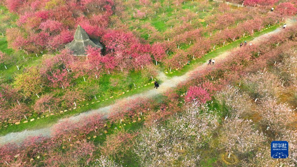 2月20日,游客在常寧市羅橋鎮廟山村櫻花園賞櫻游玩(無人機照片)。