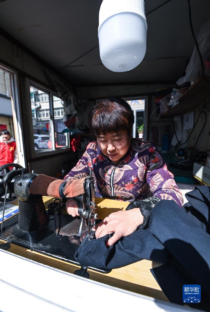 2月21日,邱芝英在浙江省杭州市富陽區銀湖街道高橋社區的便民服務亭內給居民縫補褲子。該便民服務亭由社區提供,免租金和水電費,同時還組織黨員志愿者定期進行周邊環境保潔。銀湖街道在打造現代社區的過程中,設置多個“小修小補”便民服務亭,積極打造便民生活圈、滿足居民日常生活需求。