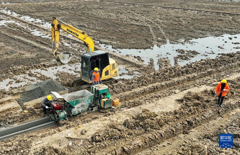 2月21日,施工人員在新建區象山鎮高標準農田建設現場硬化灌溉渠(無人機照片)。