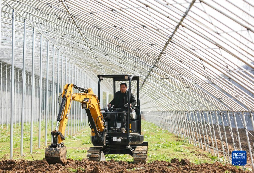 2月20日,工人駕駛機械在瑞昌市賽湖農場三分場建設智慧大棚。