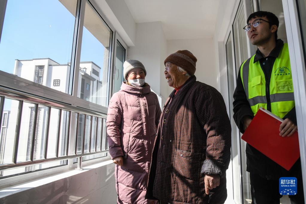 2月21日,回遷居民陳寶鳳(中)和家人在中鐵建工集團技術人員陪同下驗收新居。