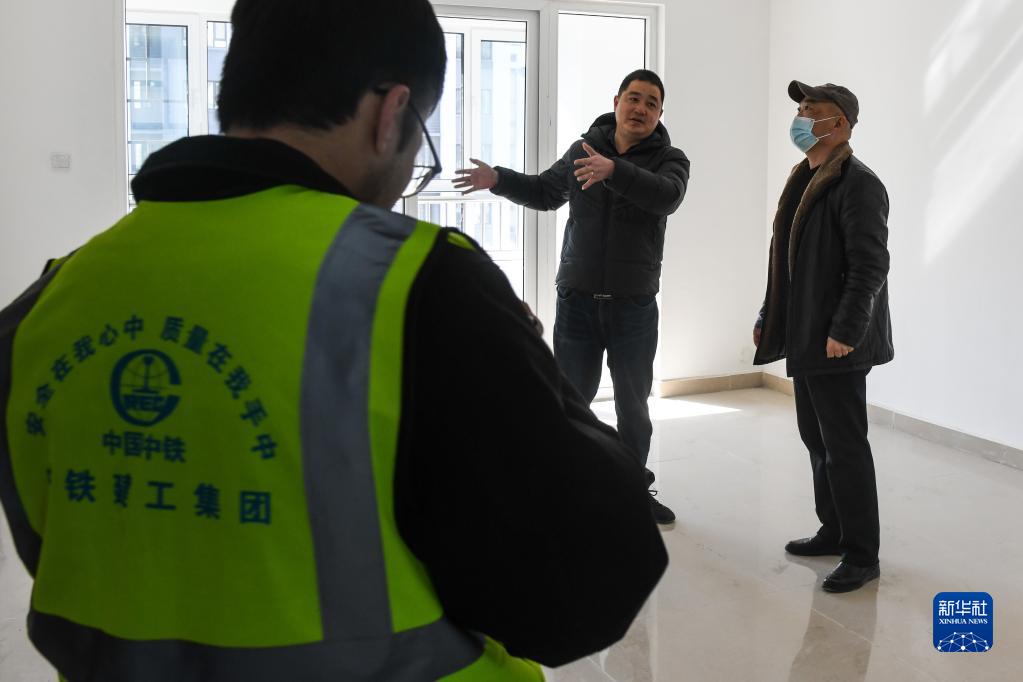 2月21日,回遷居民莊教濱(右)在中鐵建工集團技術人員陪同下驗收新居。