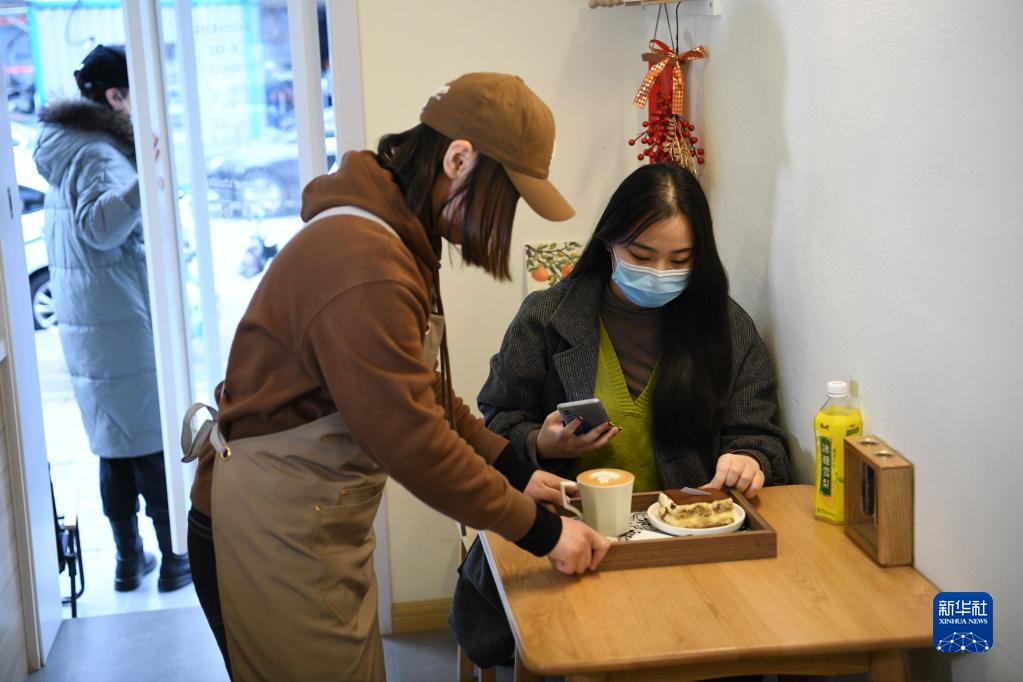 2月16日,楊倩在咖啡店里給客人端上飲品和甜點。