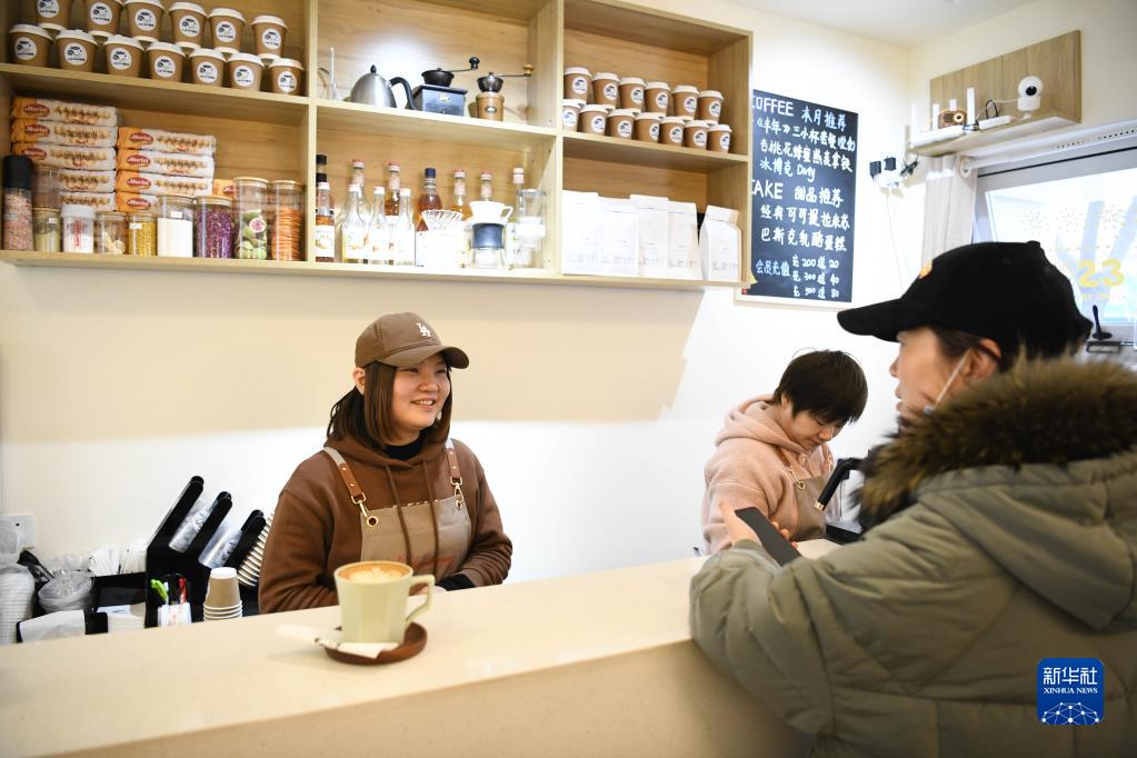 2月16日,楊倩(左)在咖啡店里與客人交流。