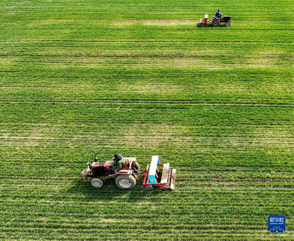 2月21日,在安徽省亳州市譙城區十河鎮位李村,農民給麥田施肥(無人機照片)。