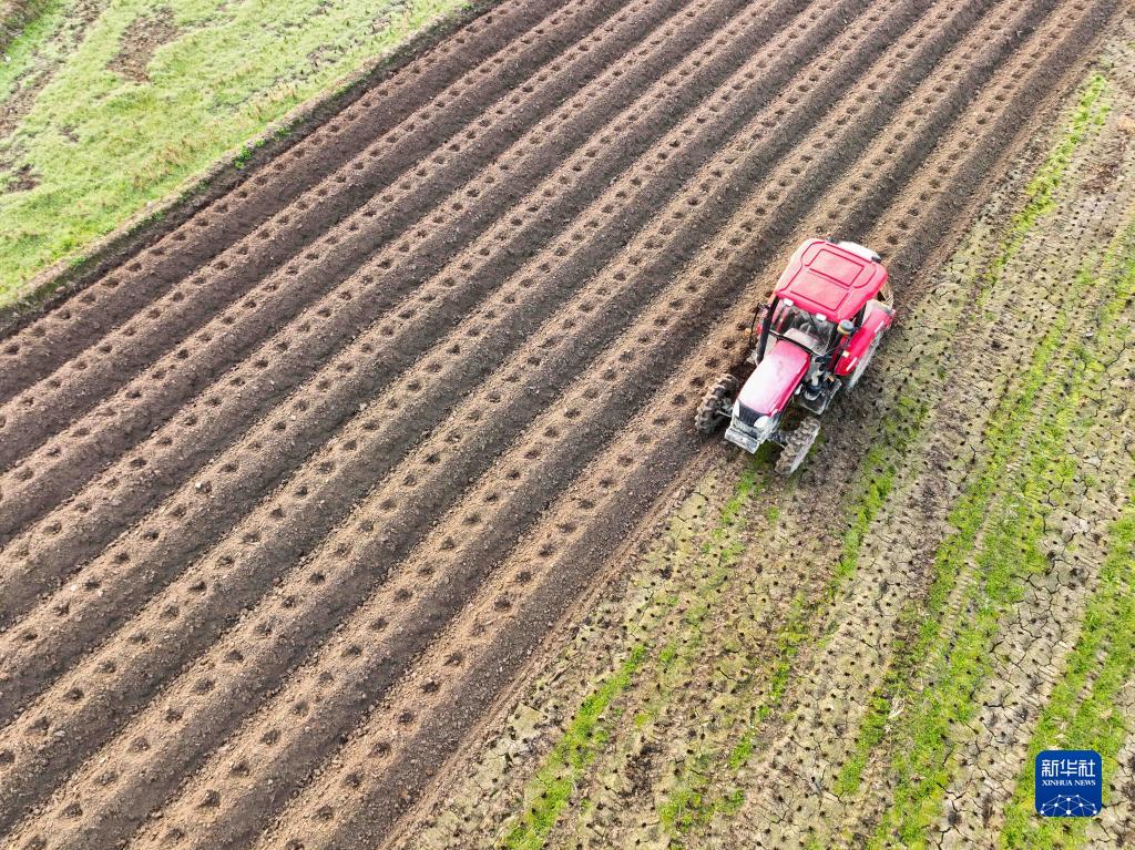 2月21日,在湖南省永州市道縣梅花鎮斯屋村,農民駕駛農機翻耕農田(無人機照片)。