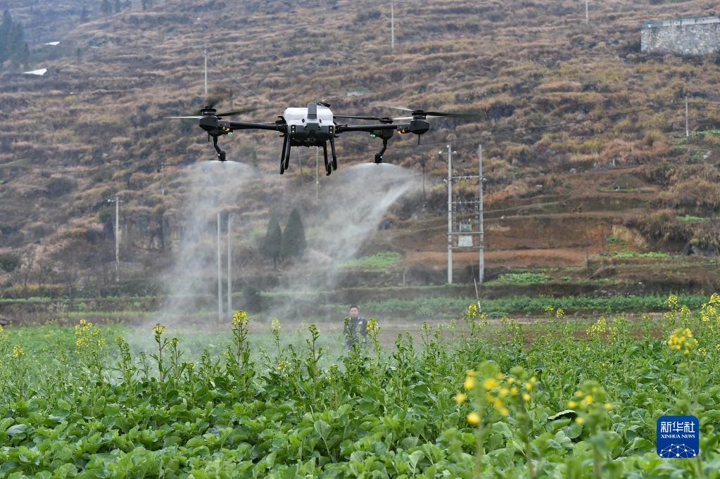 2月21日,在貴州省銅仁市松桃苗族自治縣甘龍鎮麻兔村,農戶操作無人機在田間管護油菜。