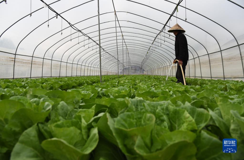 2月21日,在云南省麗江市古城區金山街道金山社區,菜農在大棚里澆水。