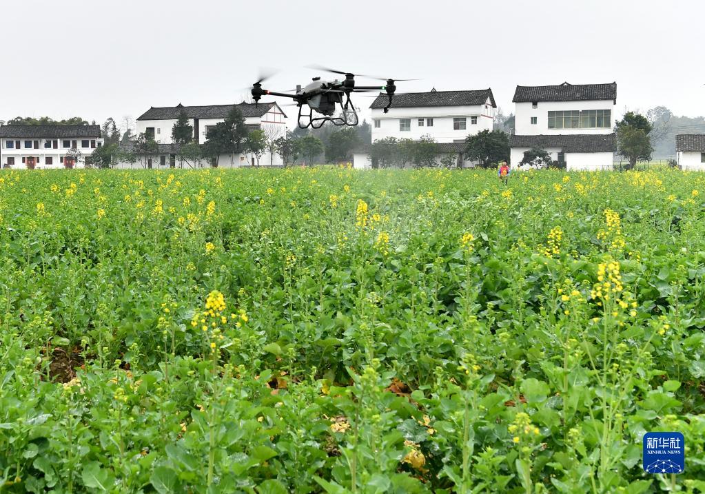 2月21日,在四川省廣安市廣安區花橋鎮花橋村,農戶操作植保無人機給油菜施肥。