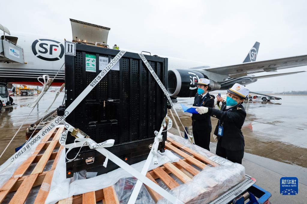 2月21日,在成都雙流國際機場,海關工作人員在停機坪監卸大熊貓“香香”。