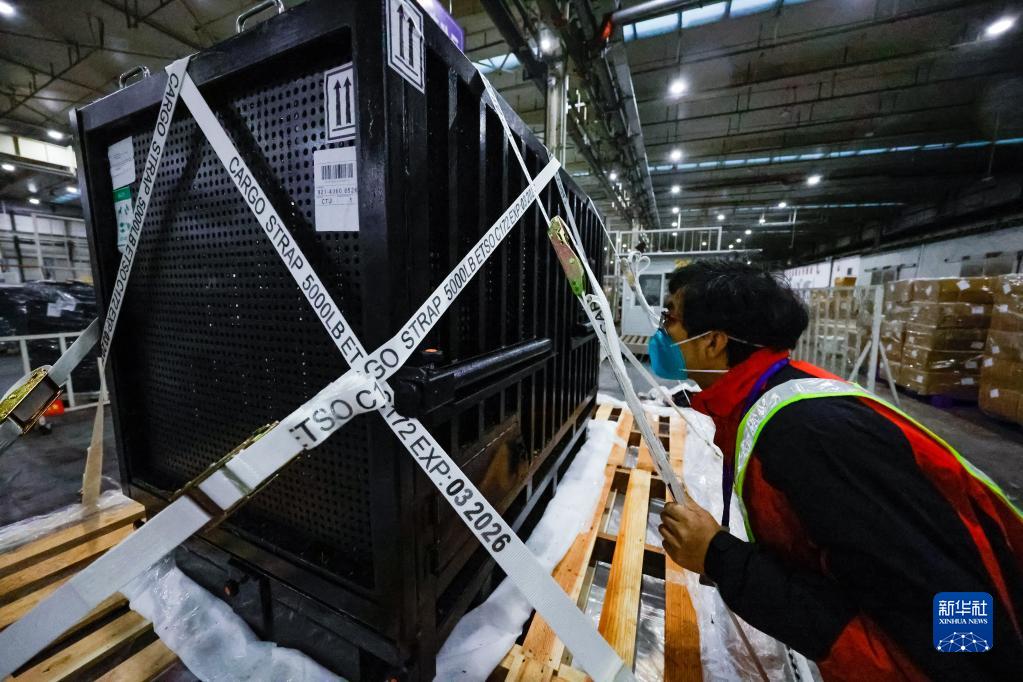 2月21日,大熊貓“香香”抵達成都雙流國際機場海關查驗區,中國大熊貓保護研究中心的獸醫在檢查其狀態。
