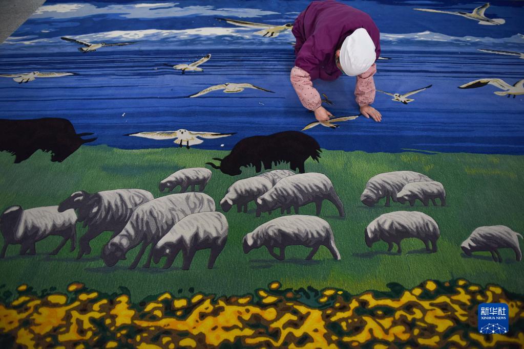 2月21日,在西寧市圣源地毯集團有限公司生產車間,操作工檢查毯面、拔花刺。